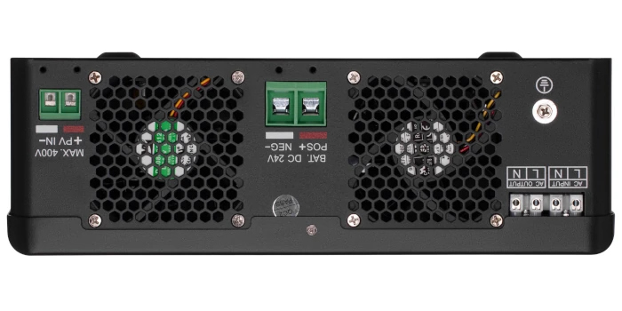 За розміру 400 × 306 × 103 мм і ваги 5,4 кг модель має доволі непогану потужність – 2,7 кВт; (PF = 0,9). Конструкцією передбачено вбудований високовольтний МРРТ сонячний зарядний пристрій, який дає змогу під’єднувати інвертор до масиву сонячних панелей потужністю до 3 000 Вт. VM-3K24H є автономним і до нього можна підключити батарею будь-якого типу 24 В постійного струму. Максимальний струм ЗП становить 80 А (комбінований) – саме цей показник визначає швидкість заряджання зовнішнього акумулятора. Інвертор забезпечує чисту синусоїду 230 В (підключення Hardwired) за режиму роботи від батареї. Щодо сигналу від сонячних панелей: вікно МРРТ – 30-400 В постійного струму.
